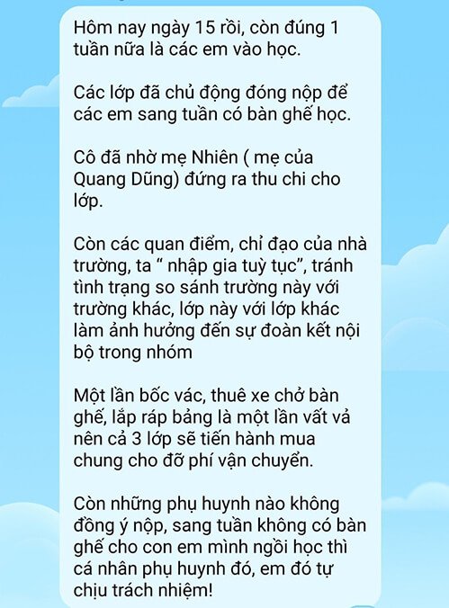 Trên nhóm chat chung giữa các phụ huynh và nhà trường, cô giáo chủ nhiệm của một lớp đã nhắn tin “nhắc nhở”: “Quan điểm, chỉ đạo của nhà trường ta là nhập gia tùy tục, tránh tình trạng so sánh trường này với trường khác. Phụ huynh nào không đồng ý nộp, sang tuần không có bàn ghế cho con em mình ngồi học thì cá nhân phụ huynh, em đó phải tự chịu trách nhiệm”.