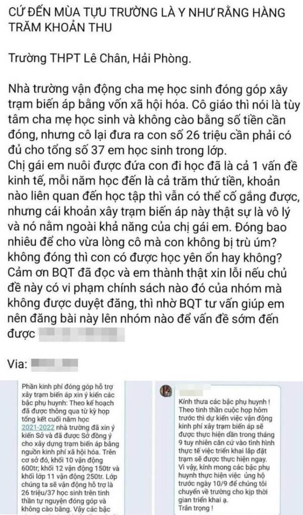 Những ngày gần đây, một số tài khoản mạng xã hội bức xúc, phản ánh về việc giáo viên Trường THPT Lê Chân vận động phụ huynh góp tiền xây trạm biến áp, có tổng giá trị gần 1 tỷ đồng.