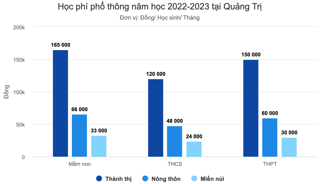 Cũng tại hướng dẫn này, Sở Giáo dục và Đào tạo Quảng Trị thông tin mức học phí phổ thông, được HĐND tỉnh thông qua giữa tháng 7. Theo đó, học phí ba bậc mầm non, THCS, THPT dao động 120.000-165.000 đồng/ học sinh/tháng với khu vực thành thị, 48.000-66.000 đồng với vùng nông thôn, 24.000-33.000 tại khu vực miền núi.